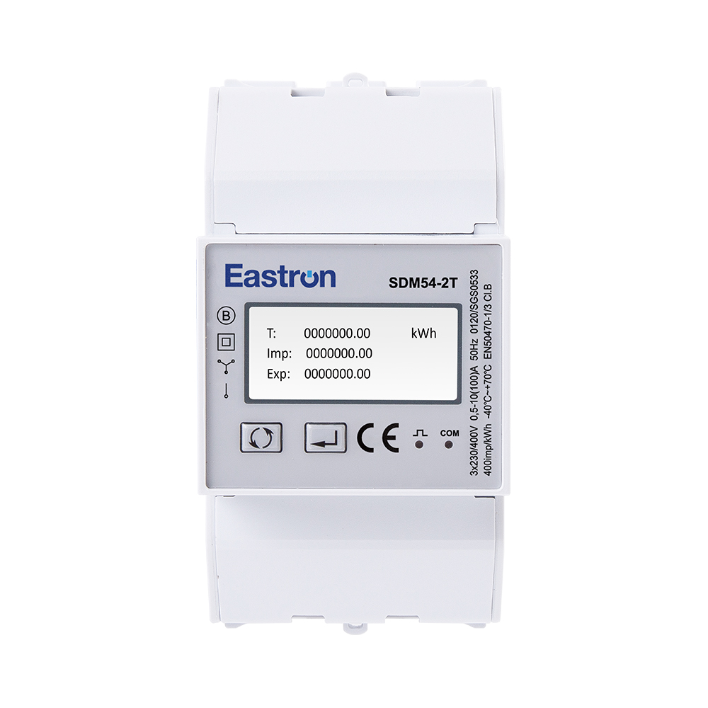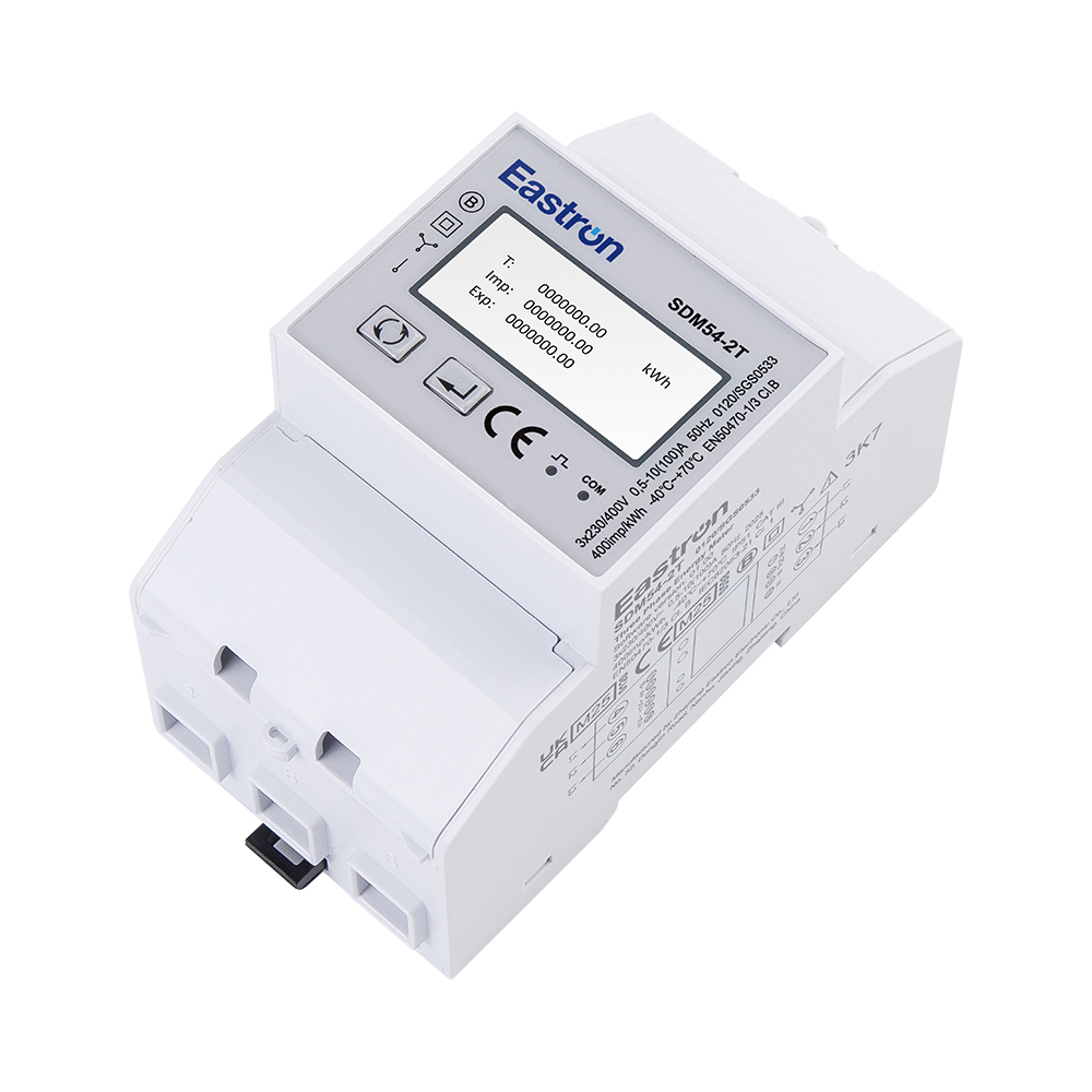 The SDM54 is a 3 Modules Dual Tariff RS485 Din Rail Three Phase Multi-function Energy Meter with backlit LCD display. It replaces 2 energy meter recording data from two different sources of energy. It provides two counters showing energy consumption on public electricity board (EB) and diesel generator (DG). The meter measures all important electrical parameters including active energy, reactive energy, current, voltage, power, power factor, frequency, etc. The units support Max. 100A direct connection, saving the cost and avoiding the trouble to connect external CTs. Two pulse outputs and 1 communication port (RS485 Modbus/DLT645) are provided for remote monitoring and setting, suitable for monitoring energy consumption in residential, solar PV, EV Charging system, industrial and utility applications.