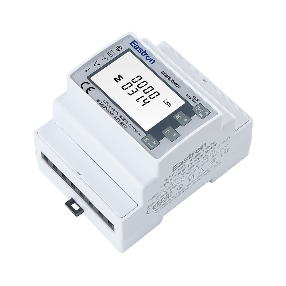 The SDM630MCT is RS485 Modbus CT operated Din Rail Three Phase Multi-function Energy Meter. Suitable for measuring and monitoring energy consumption and many other electrical parameters.The unit is 1/5A CT operated, it requires Aux.power supply(AC or DC) to power the meter. Build-in interface provides pulse and RS485 outputs. The communication type is RS485 Modbus RTU.